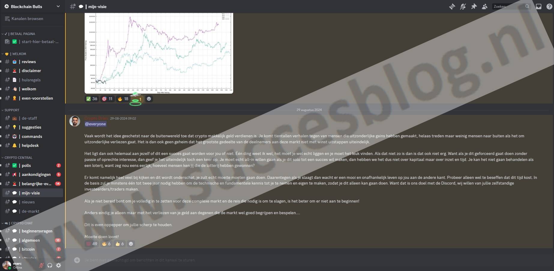 Bij de Blockchain Bulls Community leer je veel over crypto. Crypto.Dries en zijn team helpen je, elke dag. Je krijgt updates, signalen, en kan vragen stellen in live sessies. Dit kost €39,95 per maand.