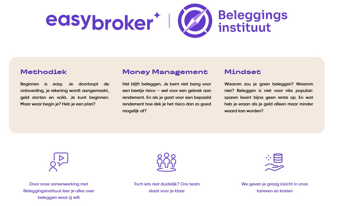 Vooral als starter in de beleggingswereld biedt Easybroker veel voordelen door hun band met het Beleggingsinstituut. Ze helpen u stap voor stap op weg zonder extra beheerkosten.