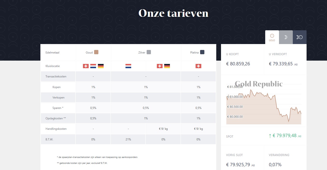 GoldRepublic rekent kosten voor het kopen en opslaan van edelmetalen. Deze kosten zijn belangrijk om te weten voordat je begint. Je betaalt een percentage van het bedrag dat je investeert.