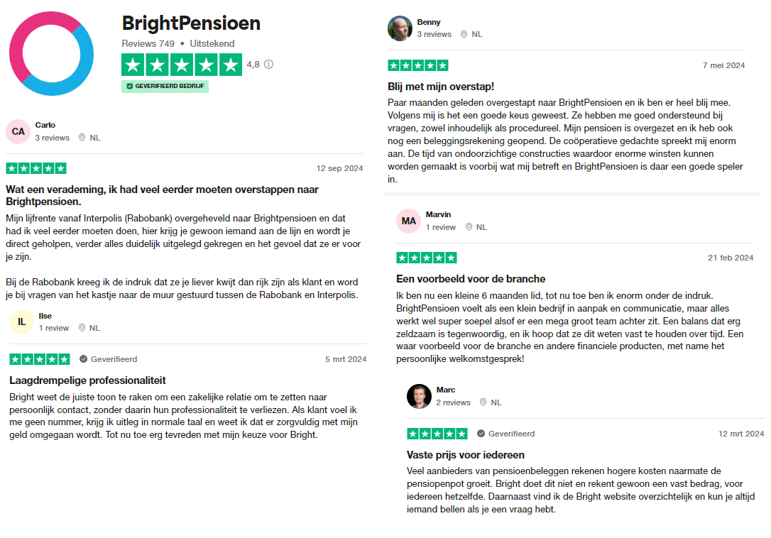 Na het bekijken van ervaringen met Meesman, laten we eens kijken naar wat klanten van BrightPensioen vinden. BrightPensioen scoort hoog op klanttevredenheid.