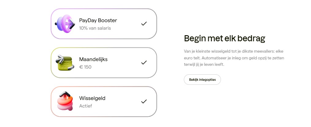 Zo begin je met een klein bedrag te beleggen. Je kunt elke dag minimaal €1 inleggen of eenmalig tot €10.000 storten. Dit maakt beleggen toegankelijk zonder dat je er veel van merkt.