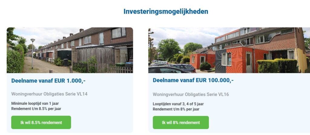 Ze richten zich vooral op langjarig verhuurde woningen in het starterssegment. Je kunt bij hen al vanaf €1.000 beginnen met beleggen via vastgoedobligaties. Dit maakt het voor zowel kleine als grote investeerders mogelijk om rendement te halen uit de woningmarkt zonder direct een heel pand te kopen.